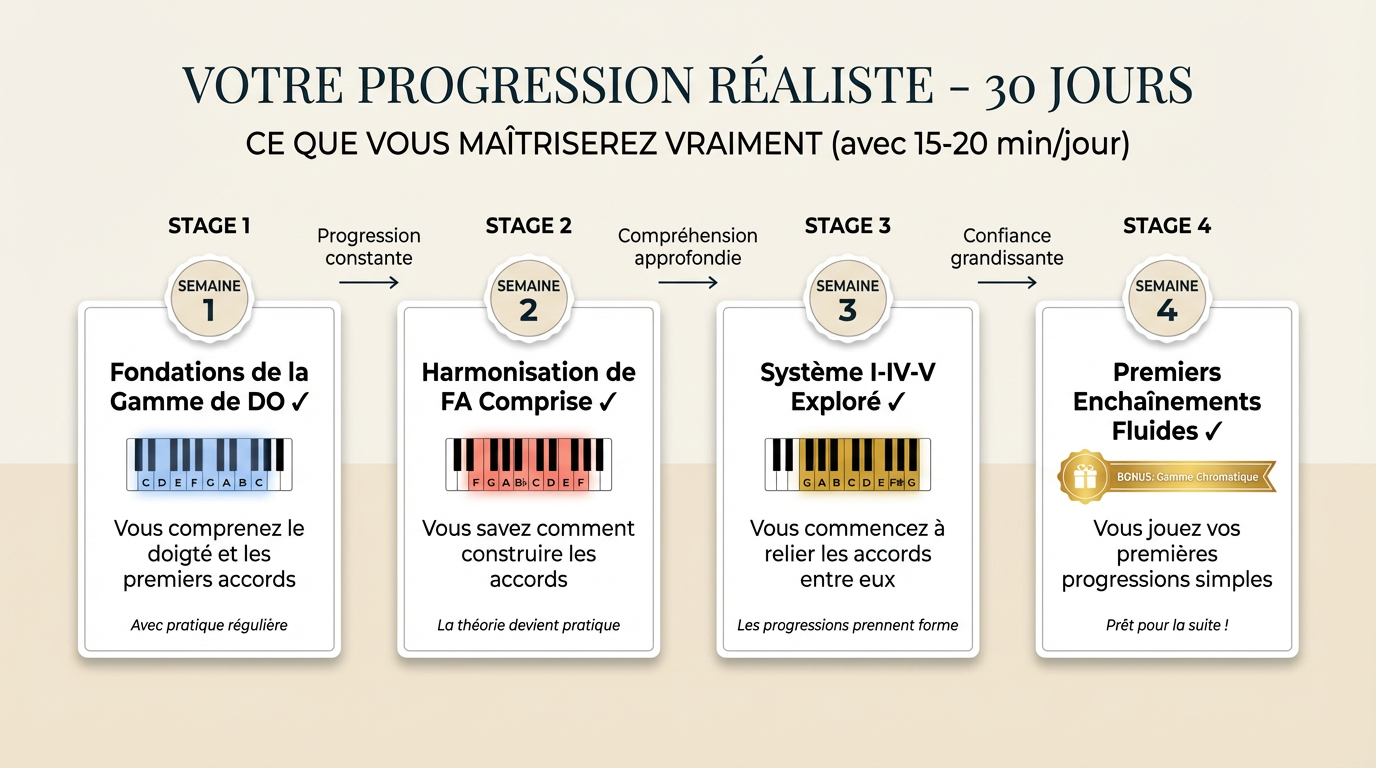 Les premiers progrès sont visibles dès la première semaine. En 30 jours de pratique régulière, vous maîtriserez votre première gamme complète avec ses harmonisations.