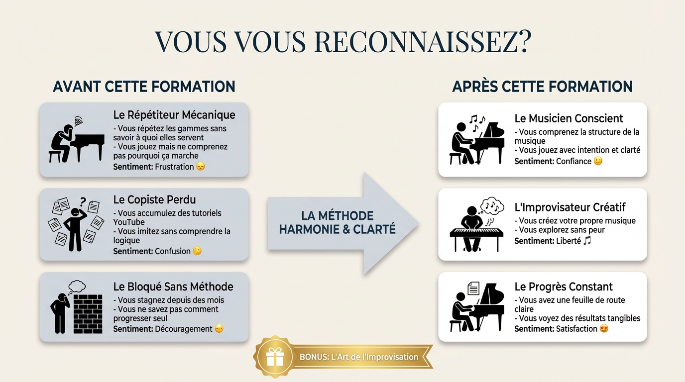 Vous répétez mécaniquement, mais personne ne vous a jamais expliqué comment transformer ces gammes en musique vivante."